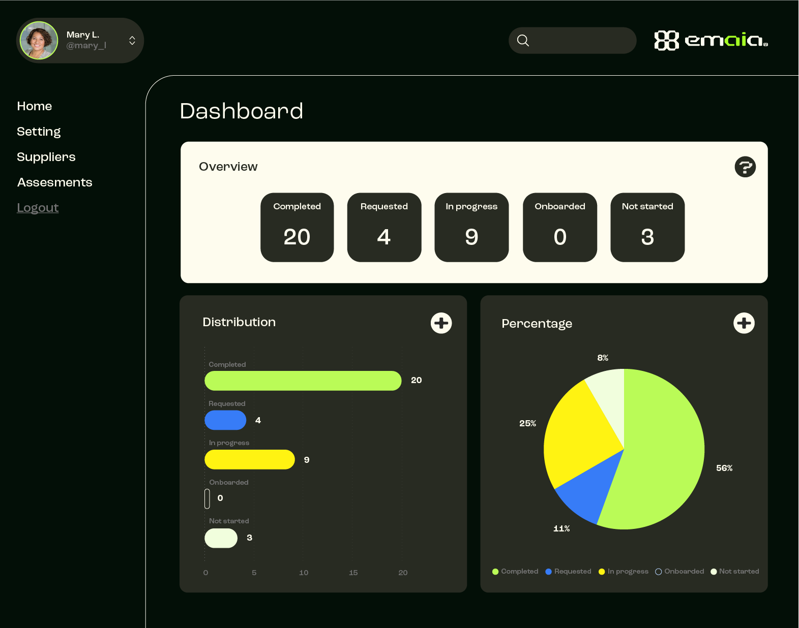 EMAIA provides a clear, intuitive dashboard showcasing scores, strengths, and weaknesses for each third party. With detailed reports and analytics, you gain the insights needed to make informed decisions and pinpoint areas for improvement.